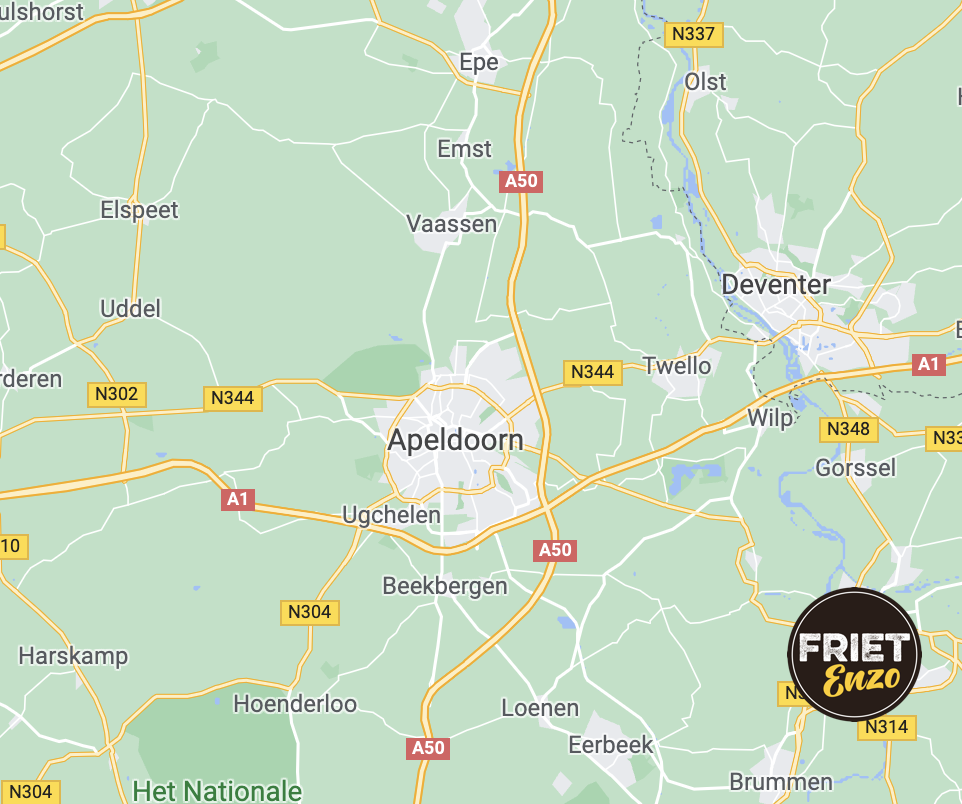 Friet enzo komt overal in uw regio. Naast Apeldoorn, komen we uiteraard ook in de omliggende regio’s, zoals Epe, Twello, Voorst, Eerbeek en Brummen.